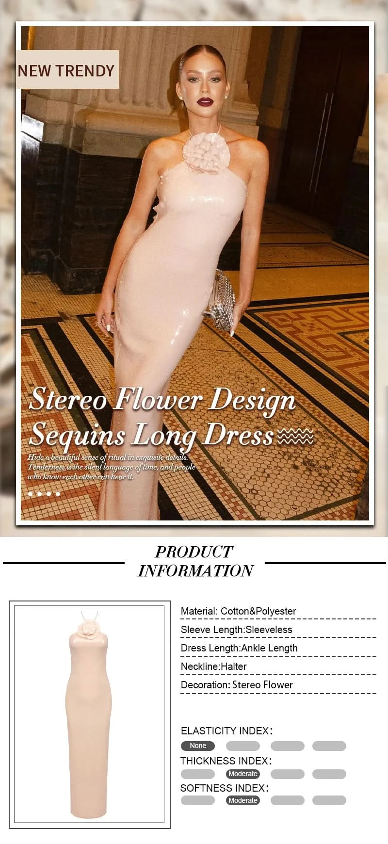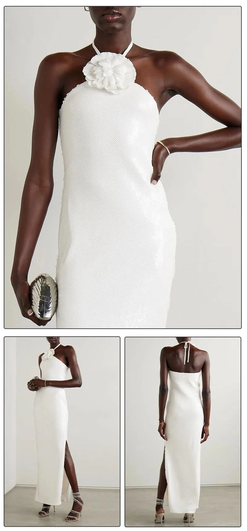 VC Women Elegant 3D Flowers Halter Backless Sexy Club Sequin Bodycon Prom Long Dress Party Festival Split Dress