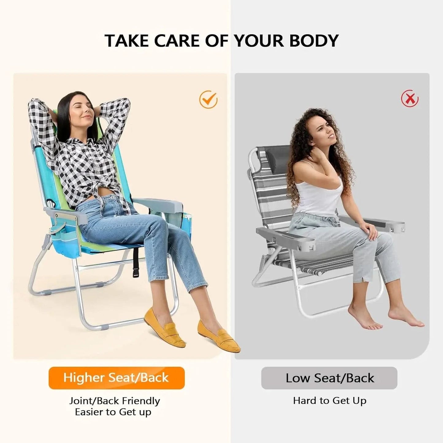 - Enhanced Comfort: With 5-Level Adjustable backrest, the lay flat beach chair has high seat and backrest for optimal joint and back support. Perfect for seniors and adults seeking extra comfort