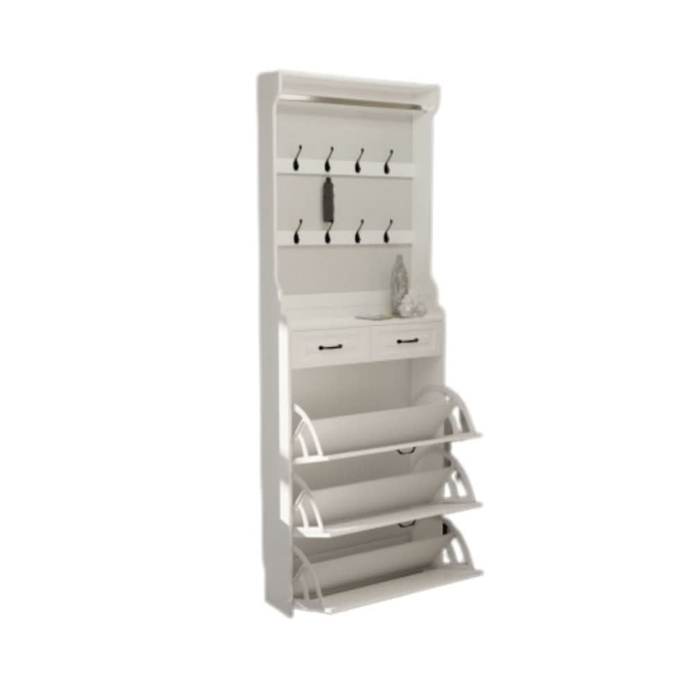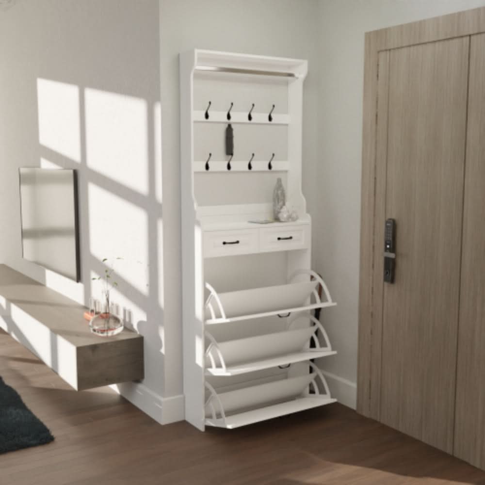 The White Shoe Cabinet with 3 Doors, 2 Drawers, and Hanger offers a clean and practical storage solution for your entryway. Its modern white design helps keep shoes and accessories neatly organized.