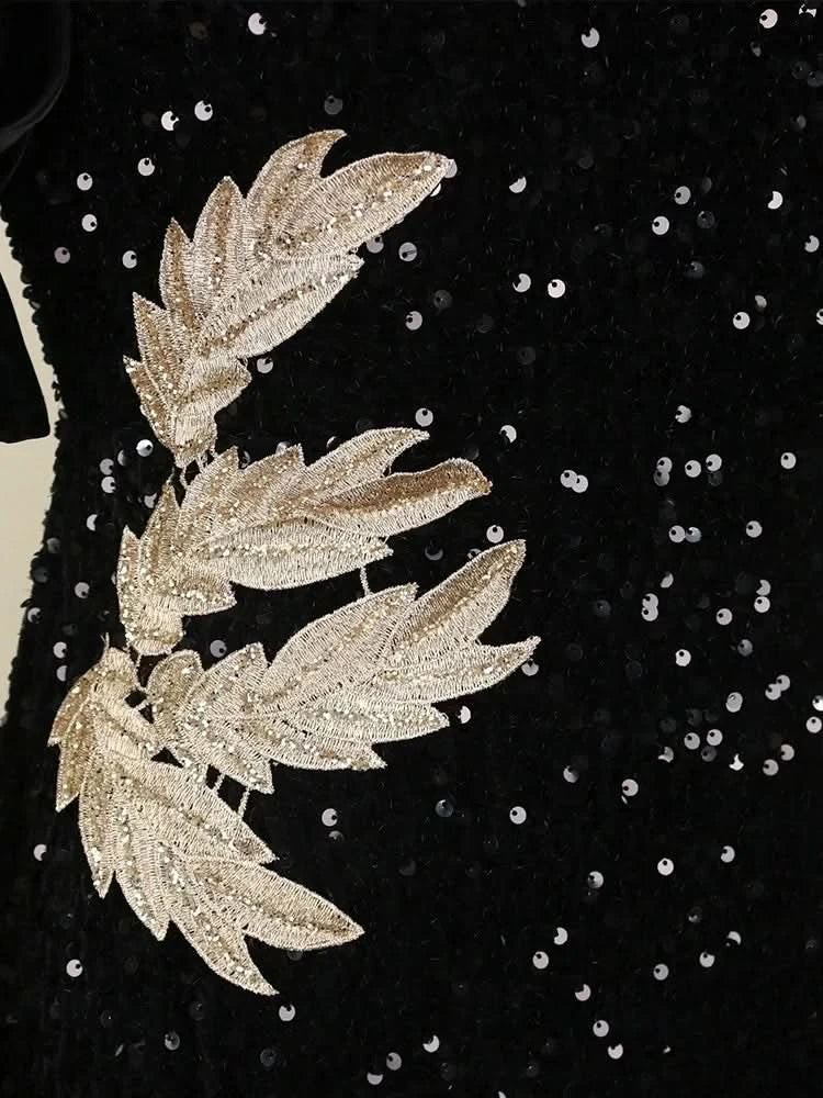 Women Sequined Shiny Black Long Dress Glitter Embroidered Chest Wrapped Puff Sleeve Classy Winter Fall Party Celebrity Gowns New